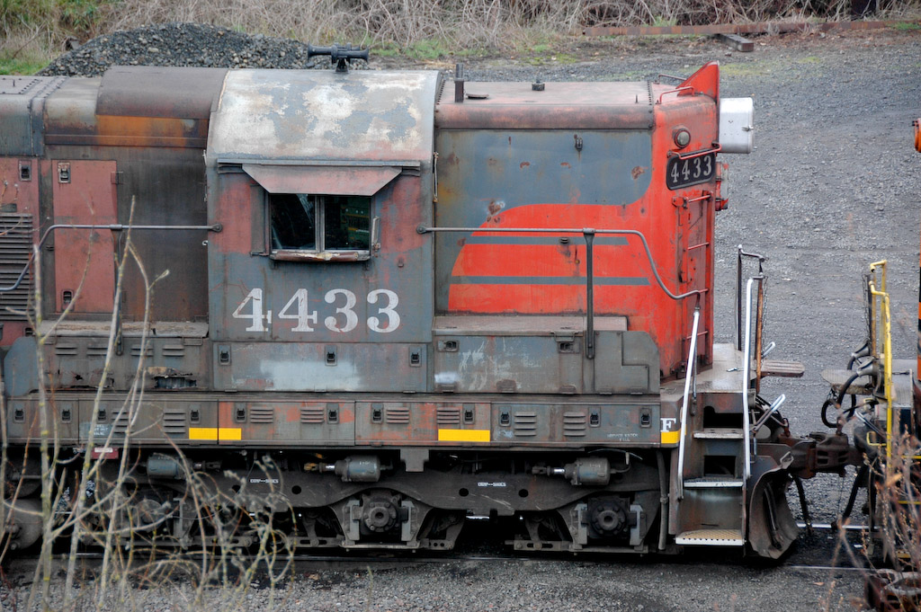 A closeup of the nose of LLW 4433, an EMD SD9E. Still bearing the remains of an aged "Bloody Nose" SP paint job this Locomotive has a lot of charcter. It might be battered, and rusty, yet it still gets the job done, as it has for 53 years now. The PNWR leases the engine from the Lavacot Locomotive Works.